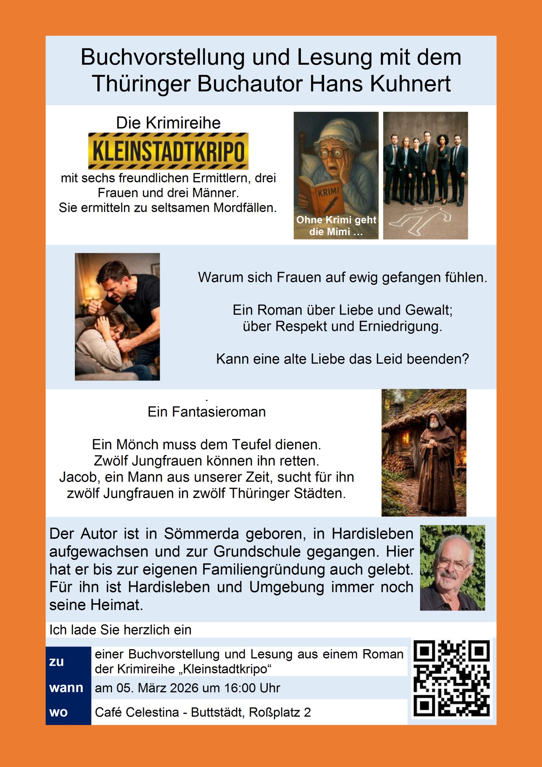Bei Kaffee und Kuchen erwartet Sie ein unterhaltsamer Nachmittag voller Literatur, Spannung und persönlicher Einblicke in das Schaffen eines heimatverbundenen Autors.