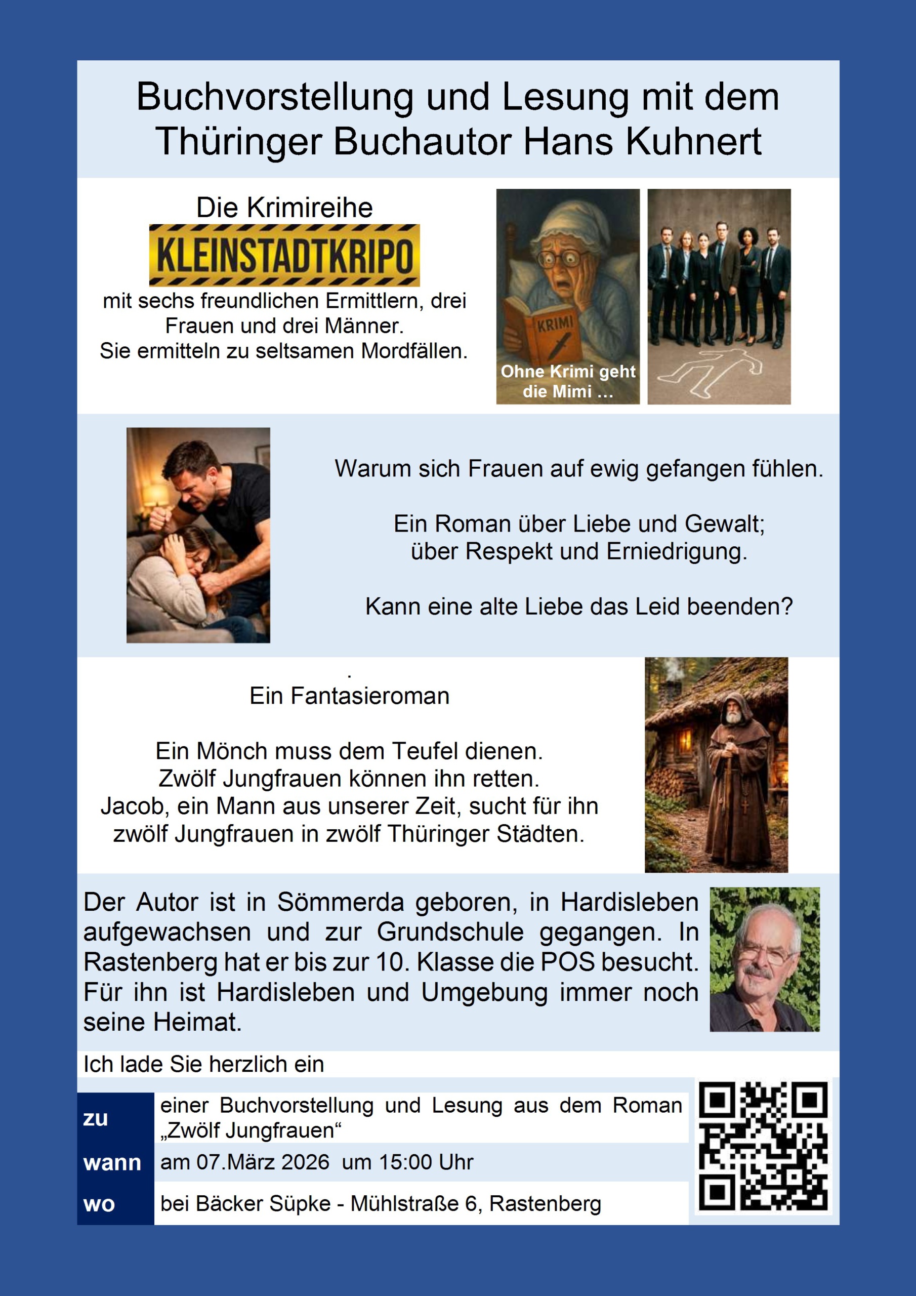 Am Freitag, den 7. März 2026, um 15:00 Uhr laden wir Sie herzlich zu einem besonderen literarischen Nachmittag in die Bäckerei Süpke (Mühlstraße 6) ein. Zu Gast ist der Thüringer Buchautor Hans Kuhnert, der aus seinem Fantasieroman „Zwölf Jungfrauen“ vorlesen wird.